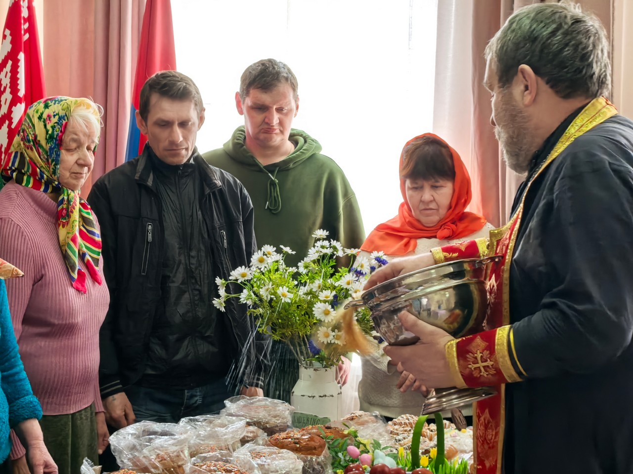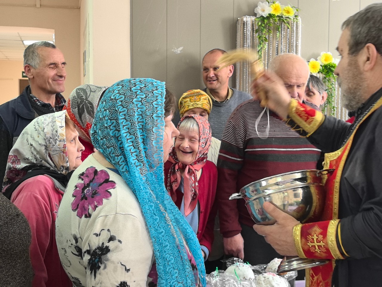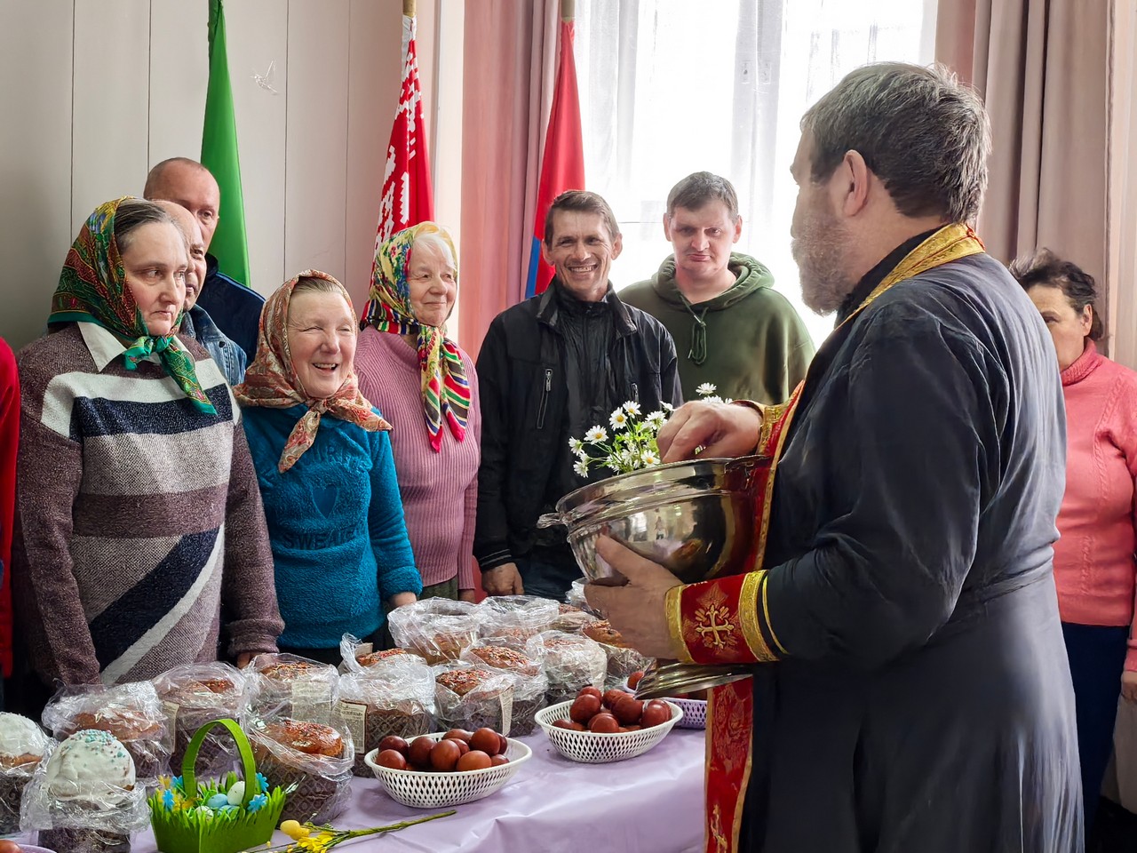 В дни Светлого Христова Воскресения настоятель храма Смоленской иконы Божией Матери аг. Октябрьская протоиерей Владимир посетил пансионат. Отец Владимир освятил пасхальные трапезы, окропил святой водой жителей и сотрудников, тепло поздравил всех с великим праздником Пасхи и рассказал о смысле и радости Воскресения Христова.